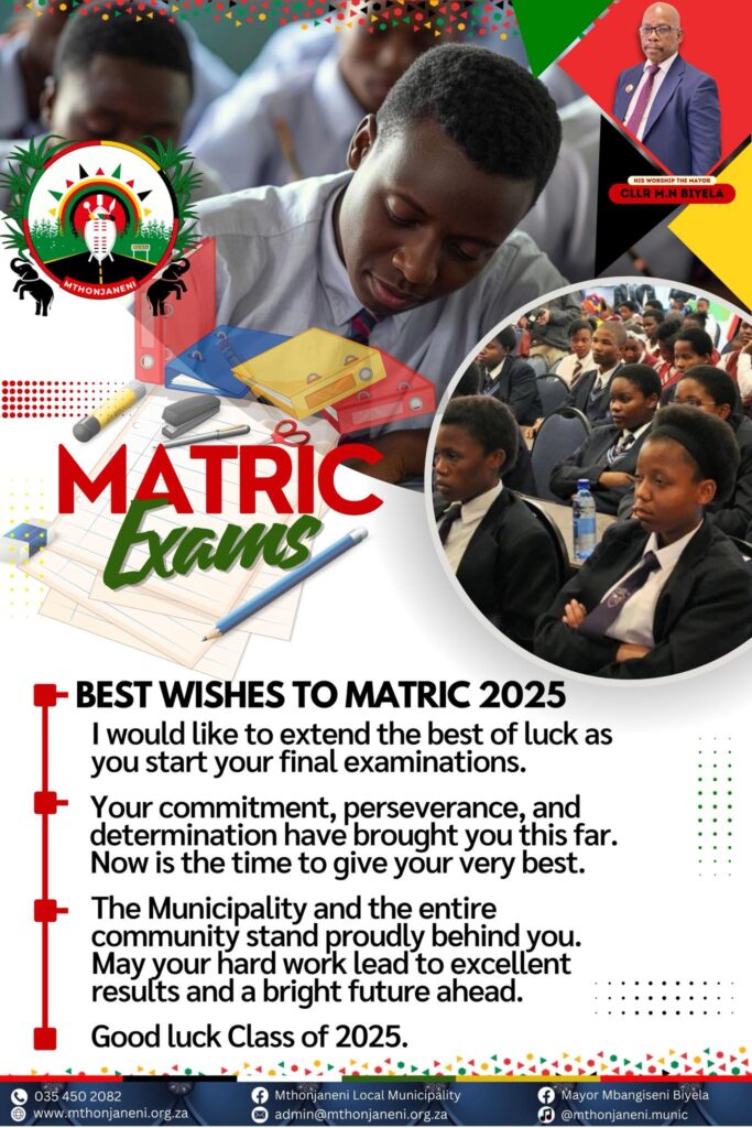 UMasipala waseMthonjaneni ohlolwa uMhlonishwa uMeya uMbangiseni Biyela ufisela bonke abafundi bakwaMatikuletsheni ukubhala okuhle kwezivivinyo zokuphela konyaka.